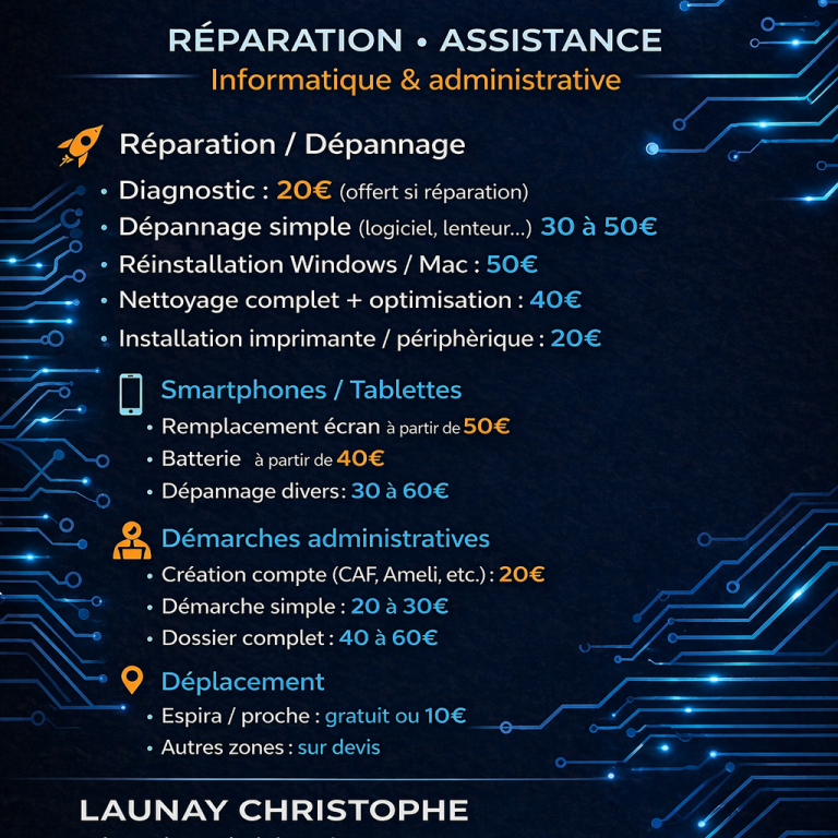 Notre entreprise propose un accompagnement personnalisé pour la réparation de téléphones, ordinateurs et autres équipements, ainsi qu’une aide concrète pour vos démarches administratives en ligne. Nous croyons en un numérique simplifié et adapté à chacun, avec la proximité et l’écoute comme valeurs fondamentales.